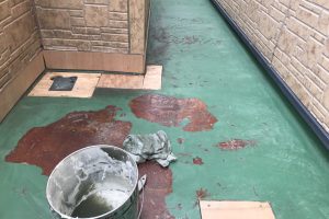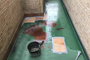 長年雨漏りの原因となっていたベランダのFRP防水の改修工事、またベランダ周辺の軒天、雨樋の塗装やコーキング打ち替え工事などの施工を行いました。